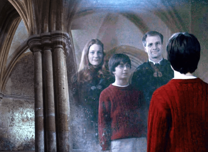 The Mirror of Erised (“Desire” backwards), for those who are wondering, is a fancy mirror that Harry finds while sneaking around the school in his first year at Hogwarts. In it he sees both of his parents, who were wizard murdered when he was a baby, standing beside him. It’s his deepest desire to have them alive again, to be able to speak with them, to spend time with them.